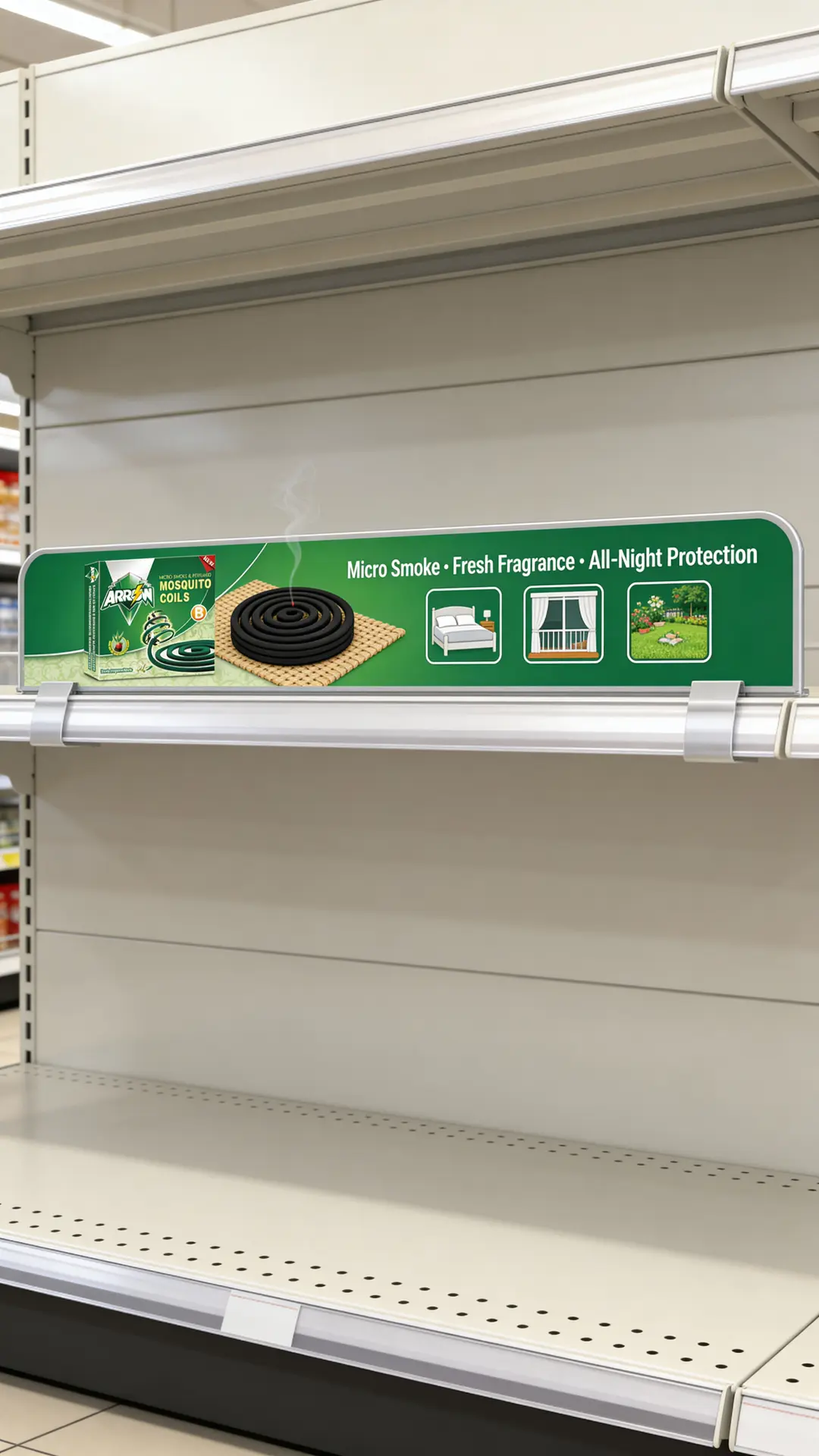 Shelf talkers & wobblers – highlighting features such as “Black micro-smoke coil”, “Comfortable fragrance”, “All-night protection”.