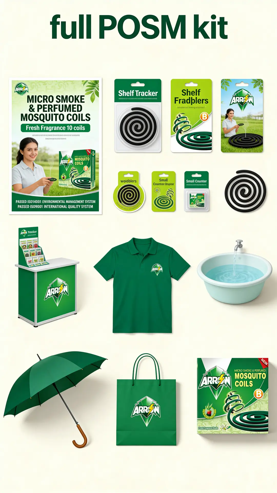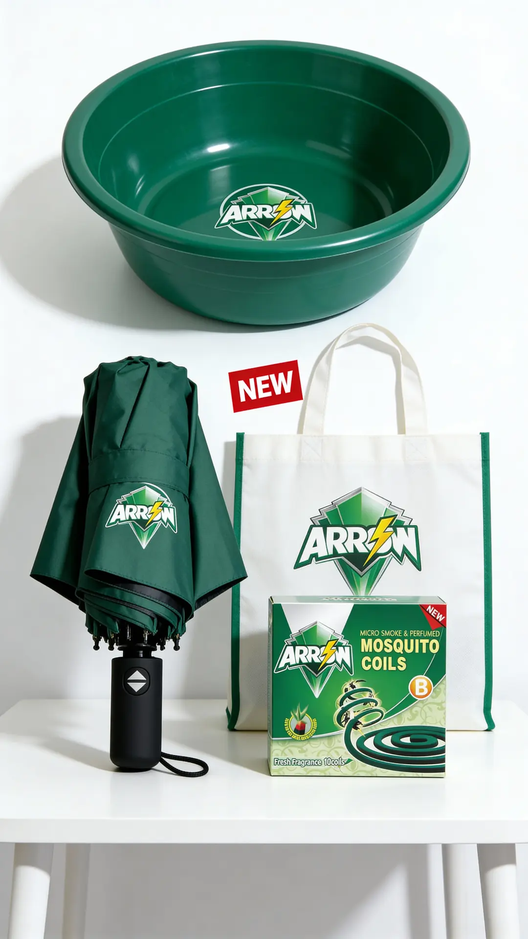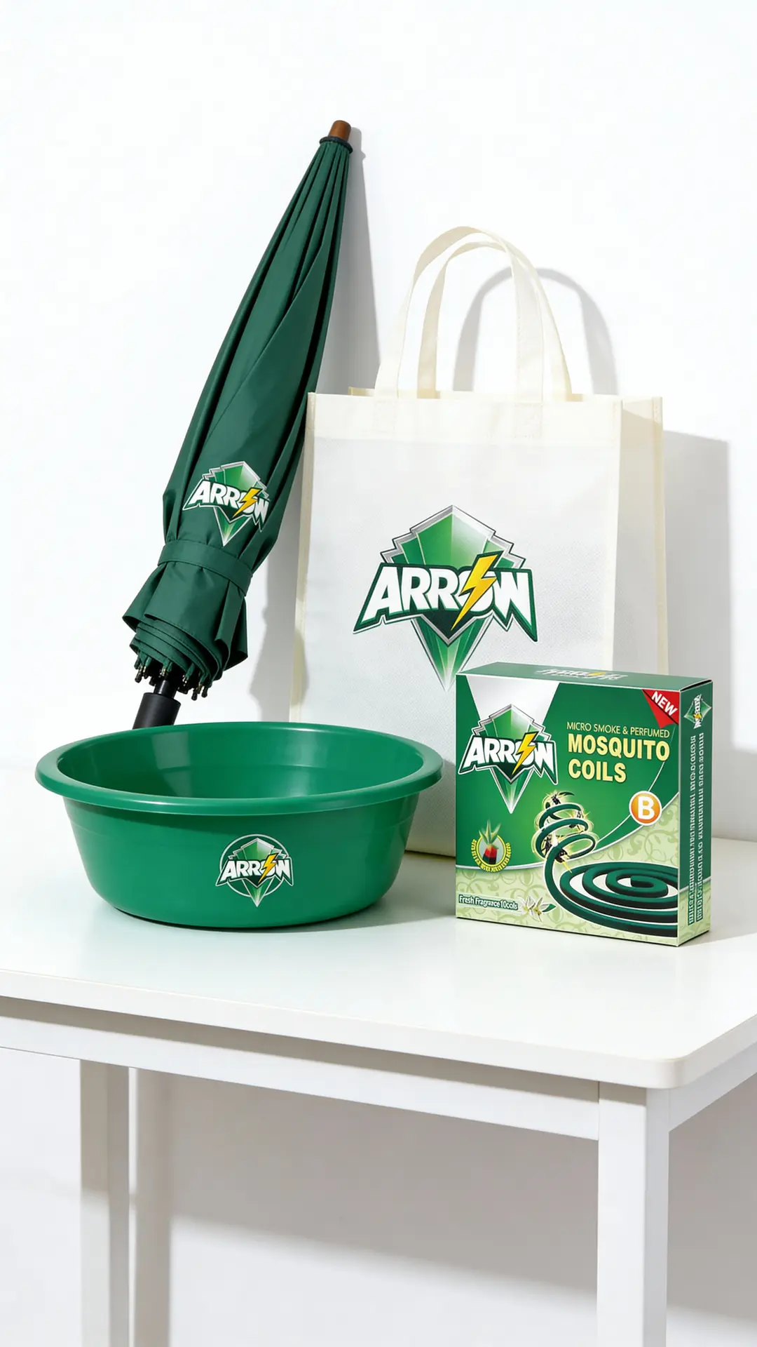 Gift items – mock-ups of ARROW-branded wash basins, umbrellas and shopping bags that can be used for “buy & get” promotions.