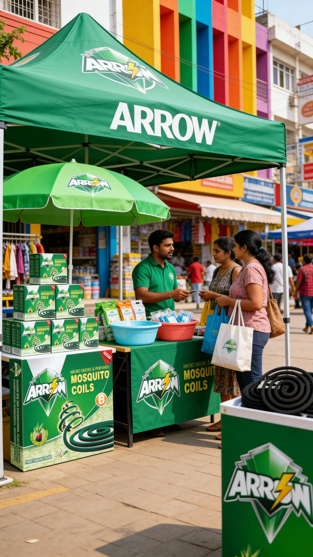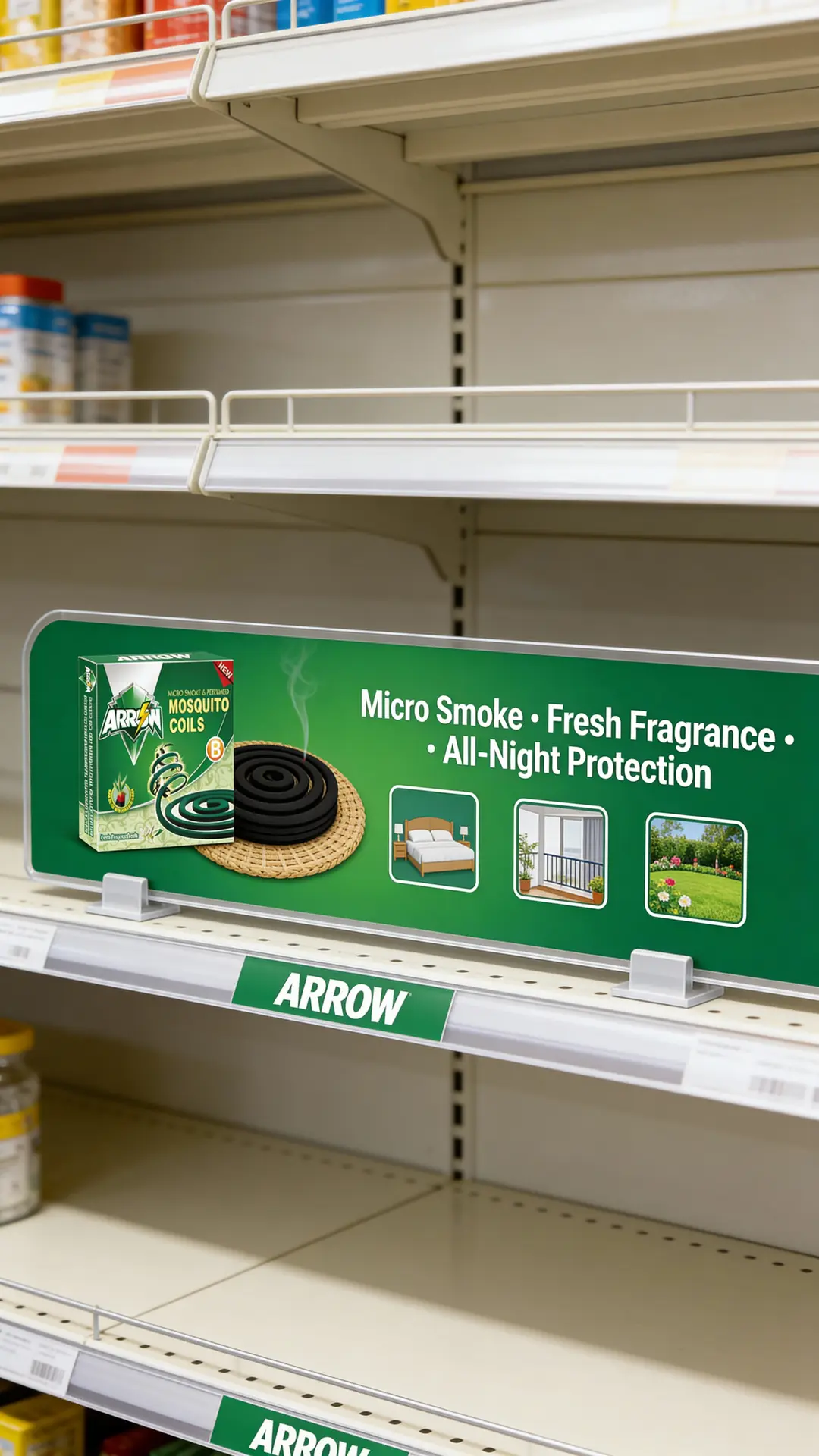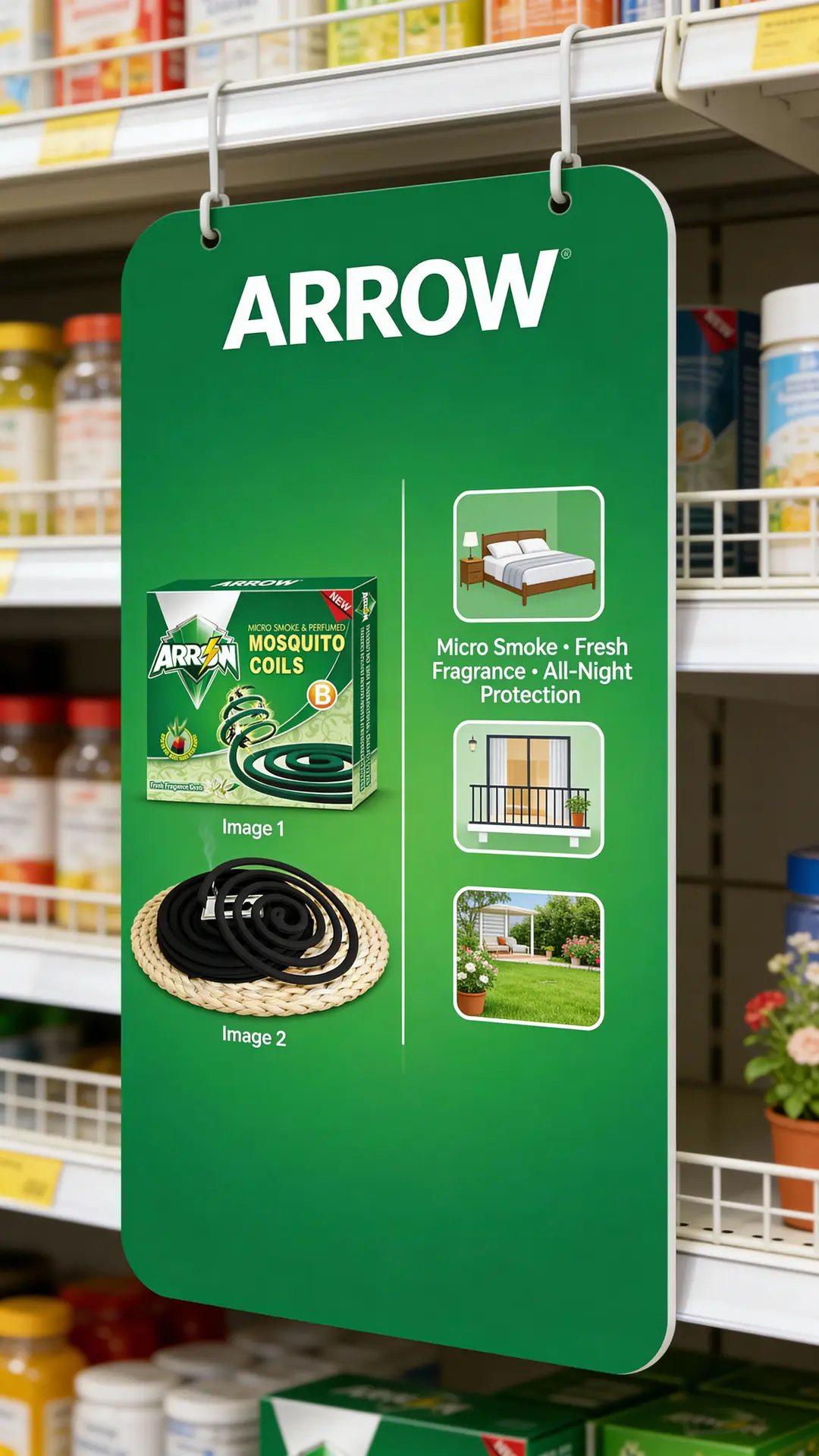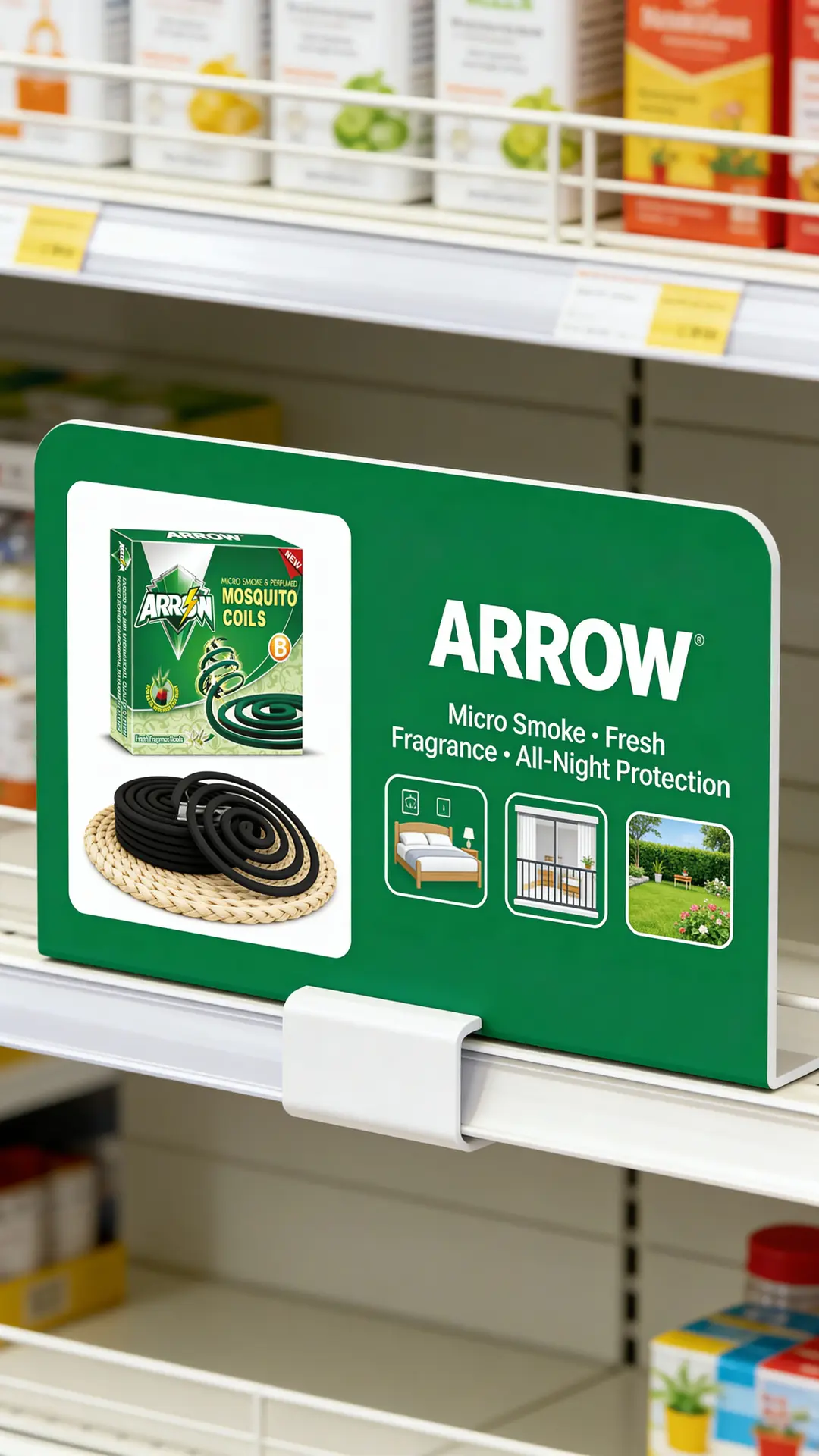 Posters and header boards – with ARROW logo, black coil visual and clear key claims like “Micro Smoke · Fresh Fragrance · Long-Lasting Protection”.