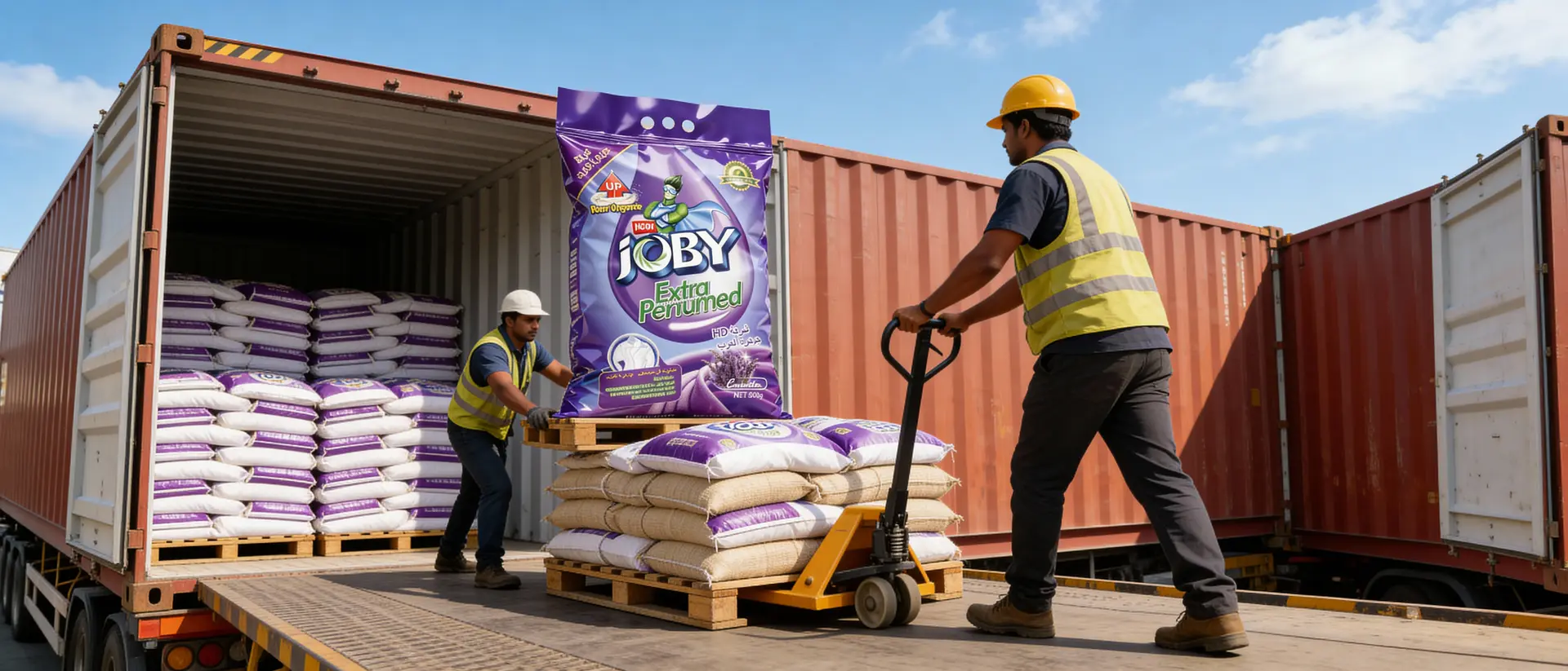 JOBY Extra Perfumed Washing Powder is palletised, shrink-wrapped and loaded carefully in woven bags and cartons for safe transport.