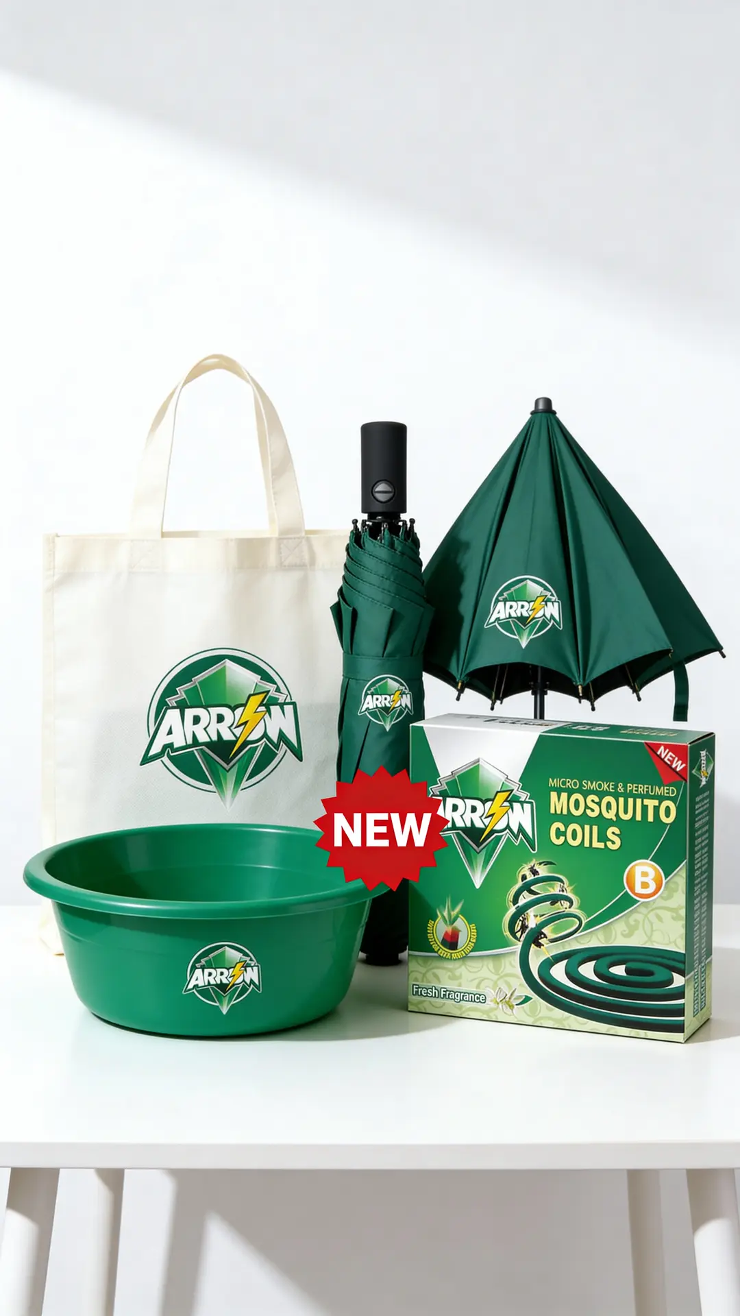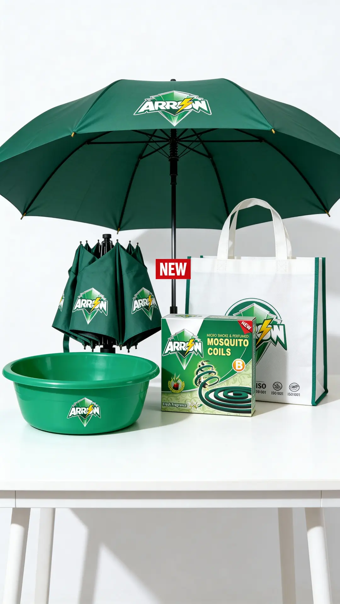 Gift items – mock-ups of ARROW-branded wash basins, umbrellas and shopping bags that can be used for “buy & get” promotions.