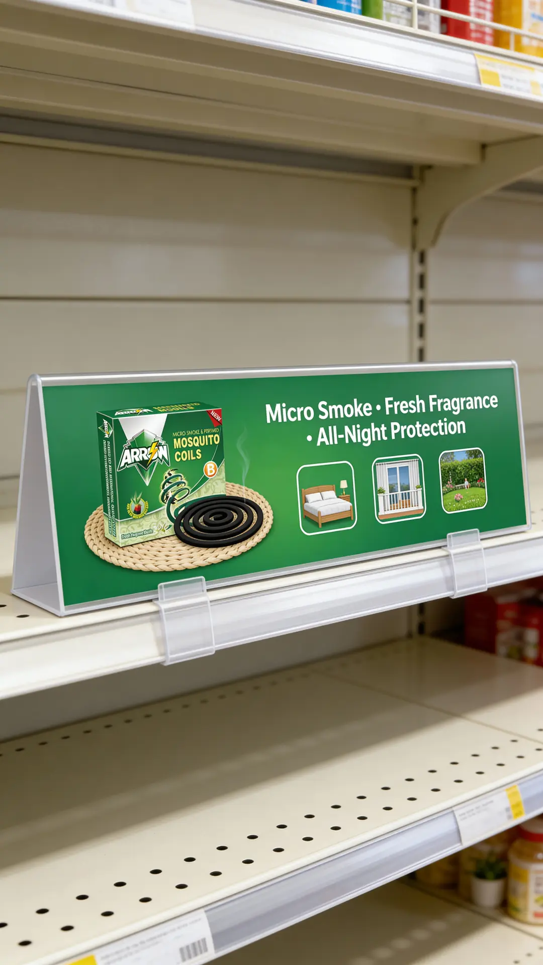 Shelf talkers & wobblers – highlighting features such as “Black micro-smoke coil”, “Comfortable fragrance”, “All-night protection”.