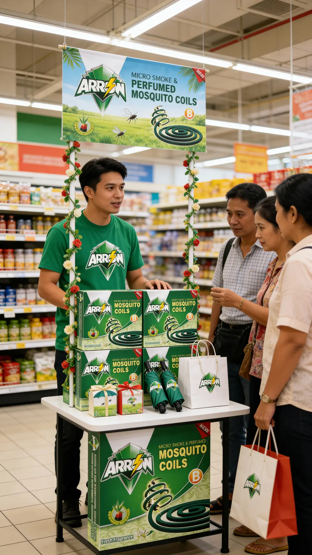Posters and header boards – with ARROW logo, black coil visual and clear key claims like “Micro Smoke · Fresh Fragrance · Long-Lasting Protection”.