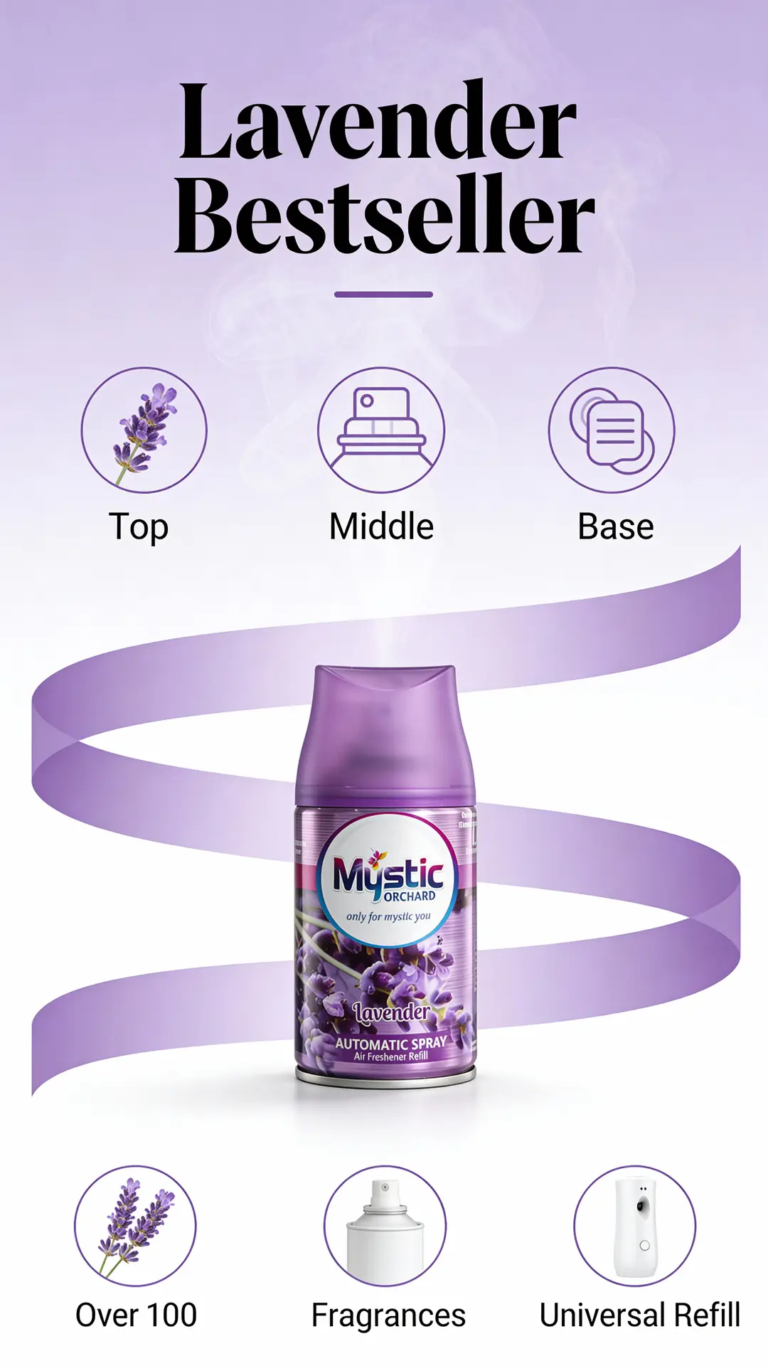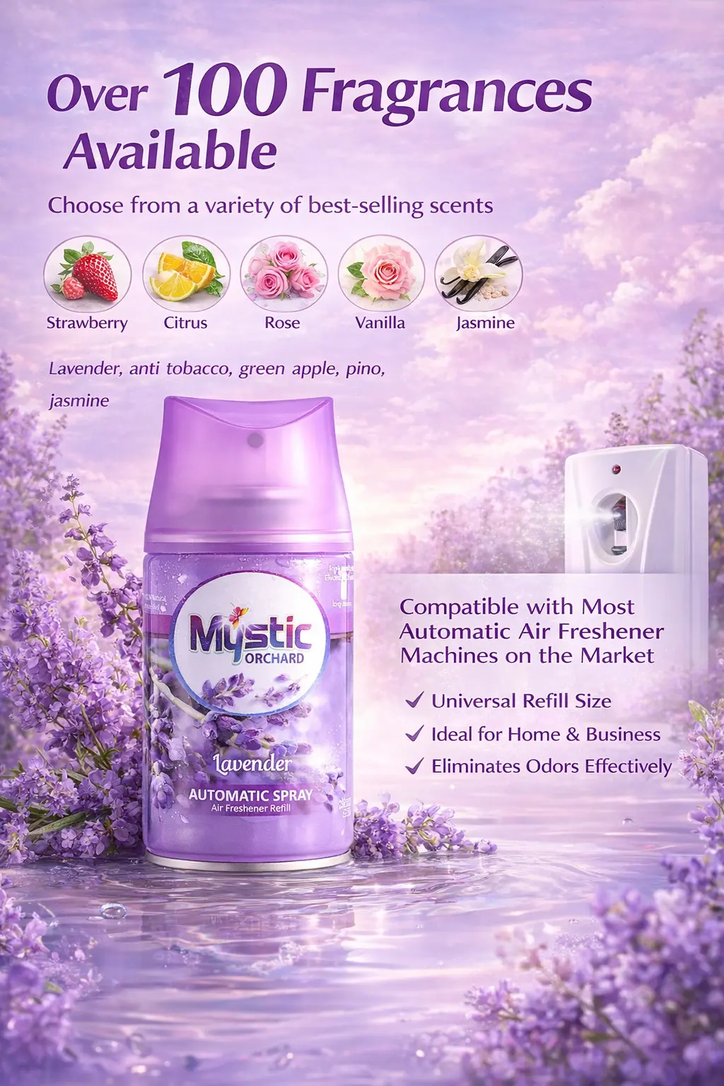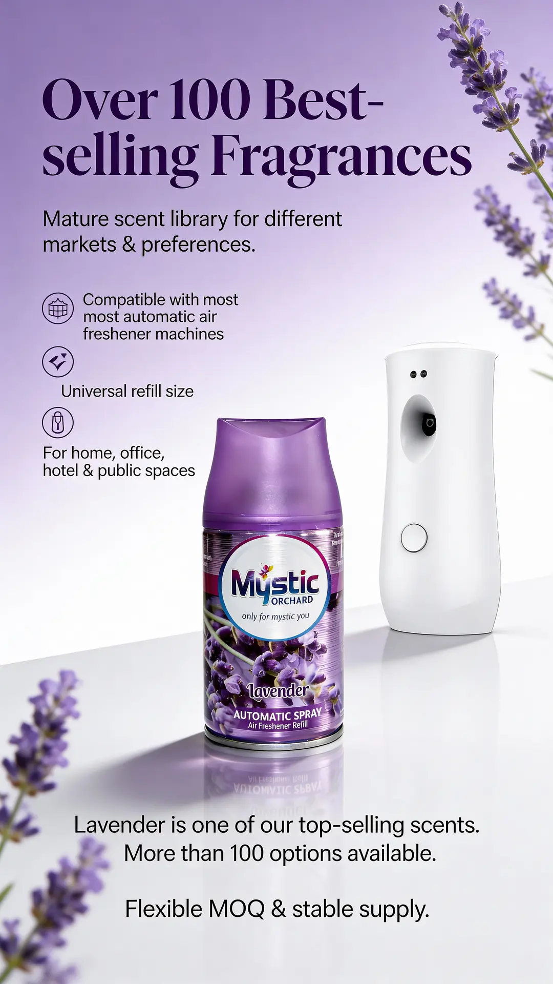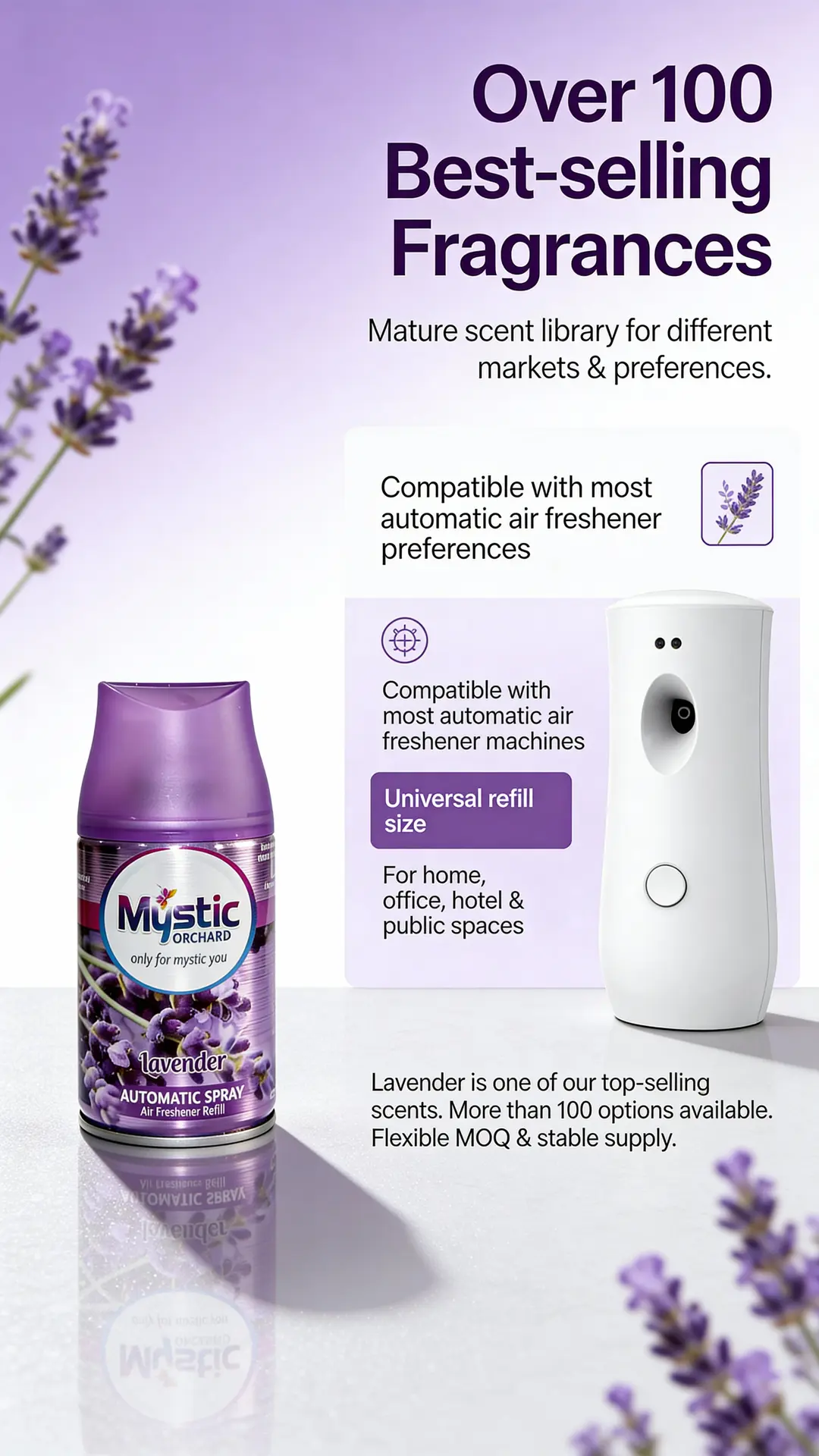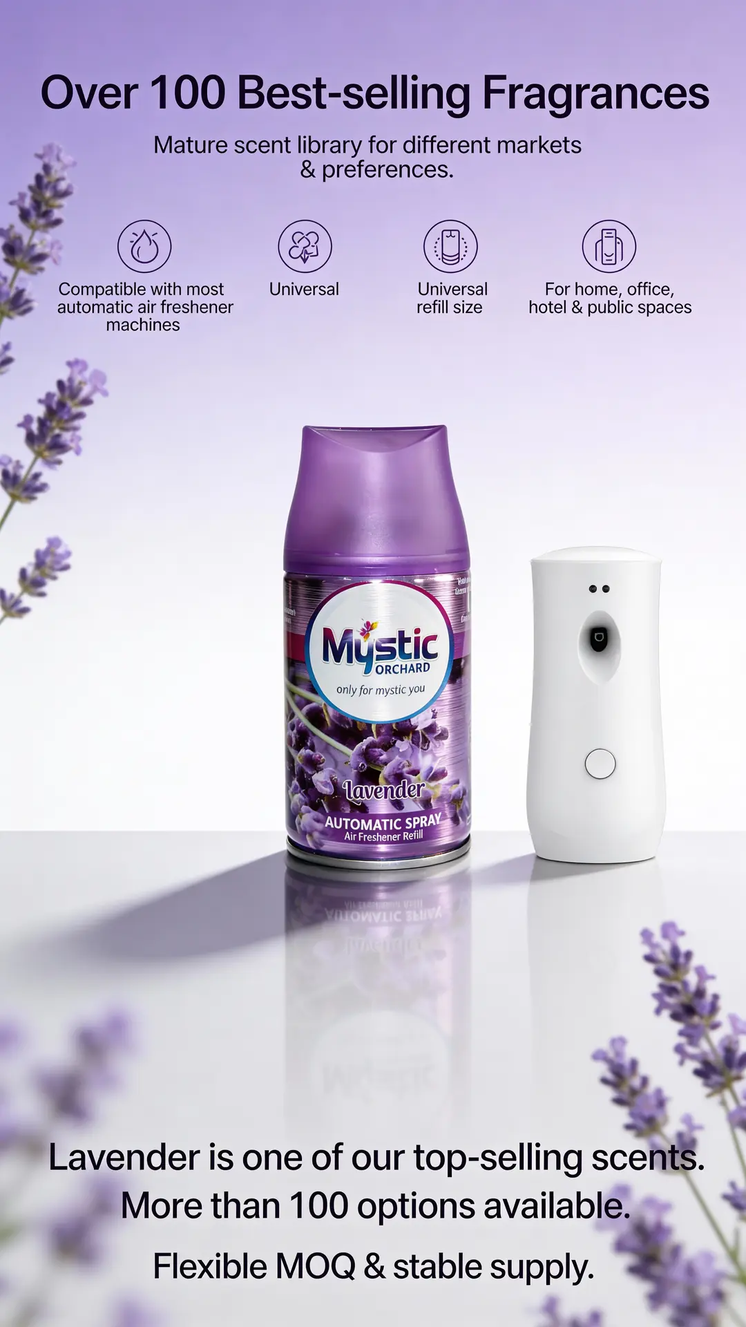 Designed for wide compatibility with mainstream automatic spray dispensers, this refill range offers 120+ market best-selling fragrances and stable factory supply for long-term distribution growth.