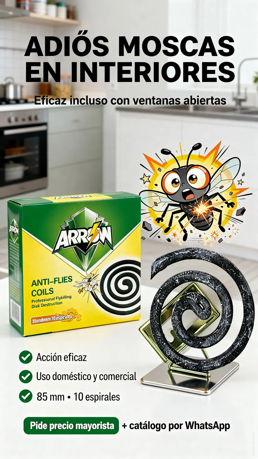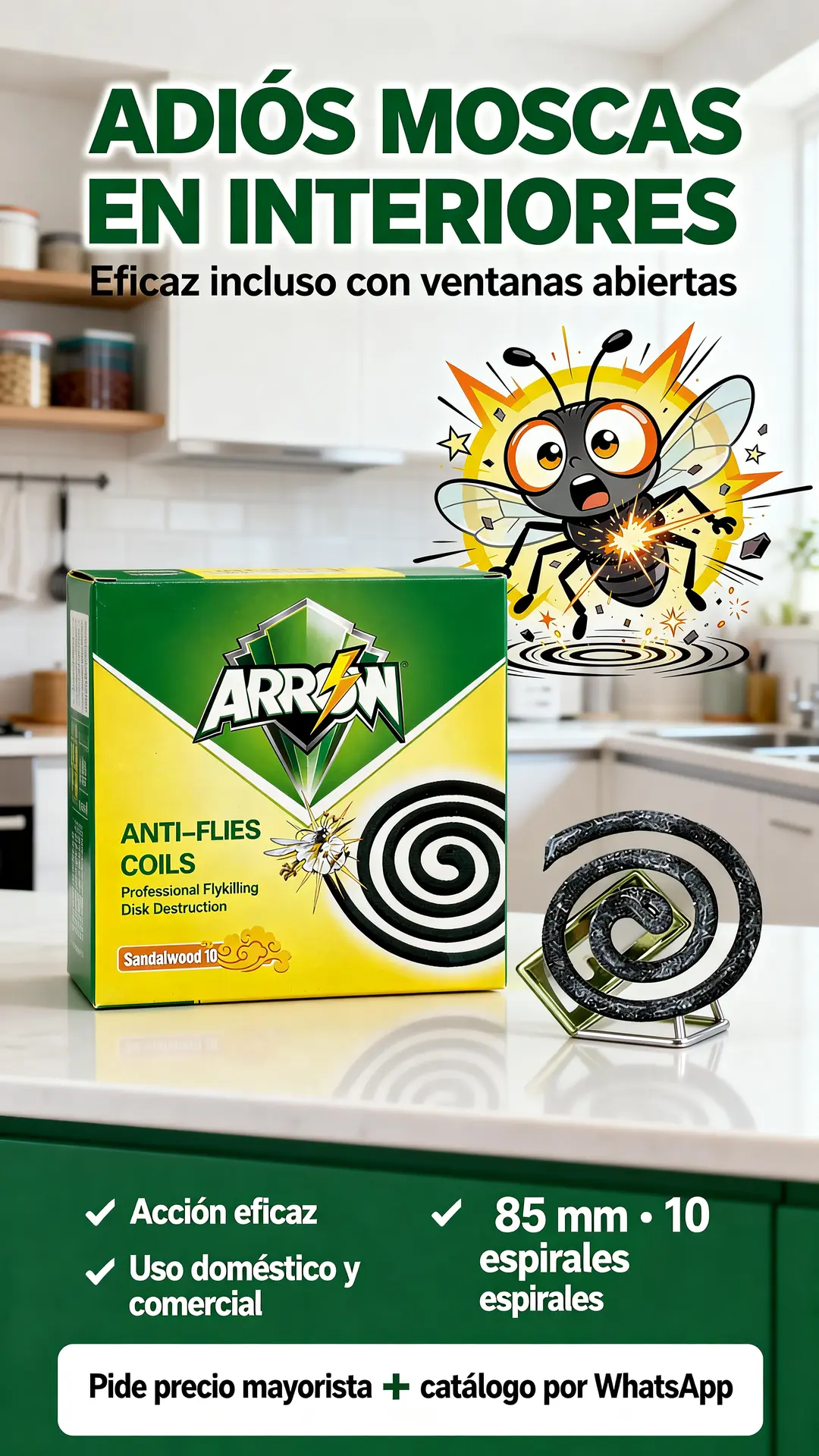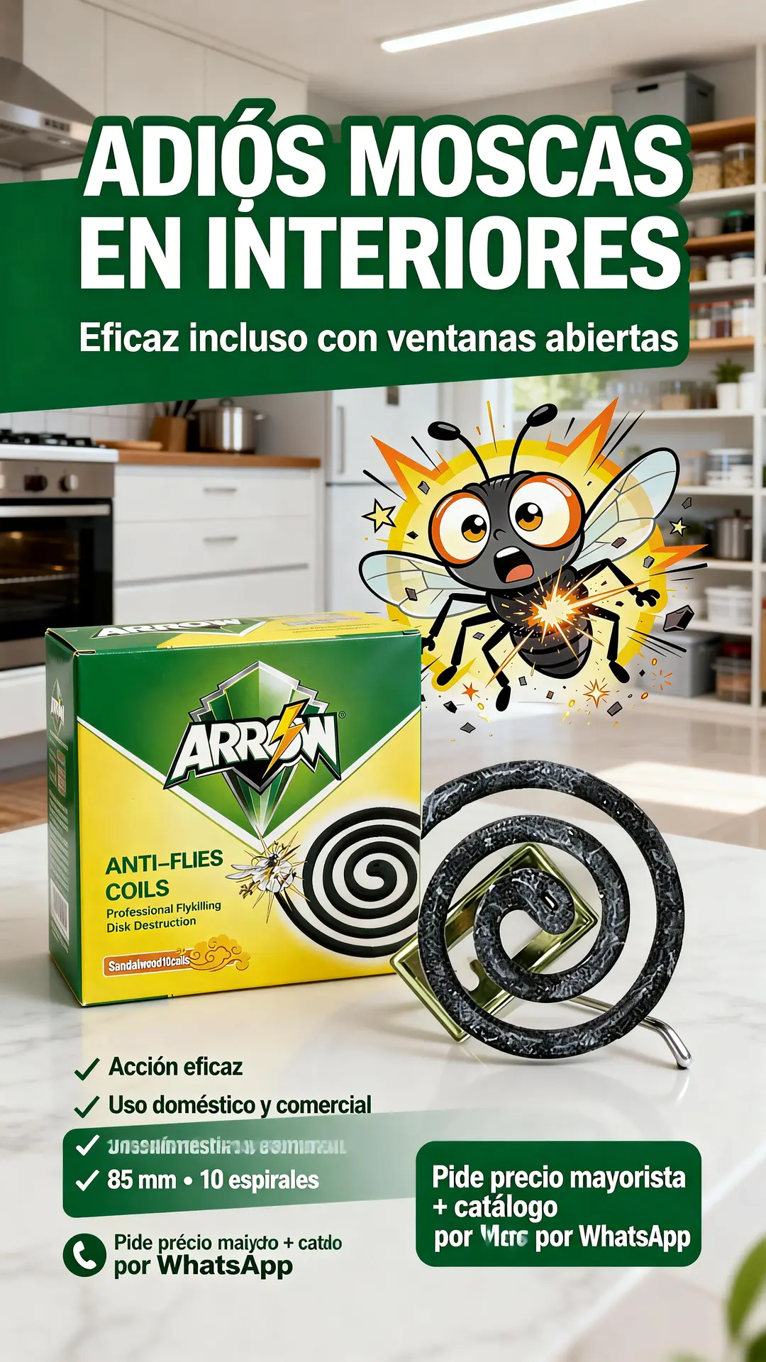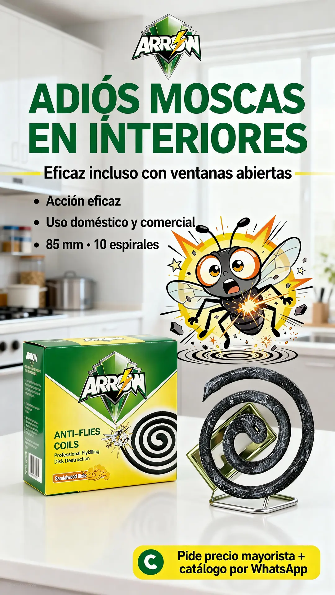 ¿Moscas en interiores? Prueba ARROW Anti-Moscas — acción rápida y humo ligero. Escríbenos para precio mayorista y catálogo.