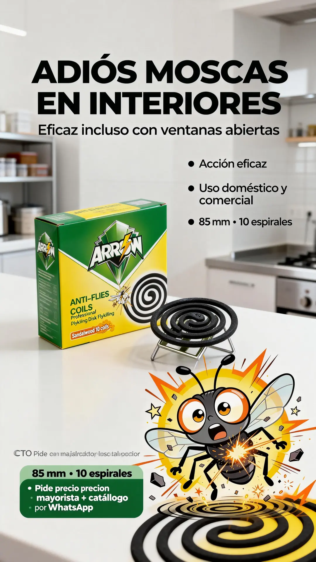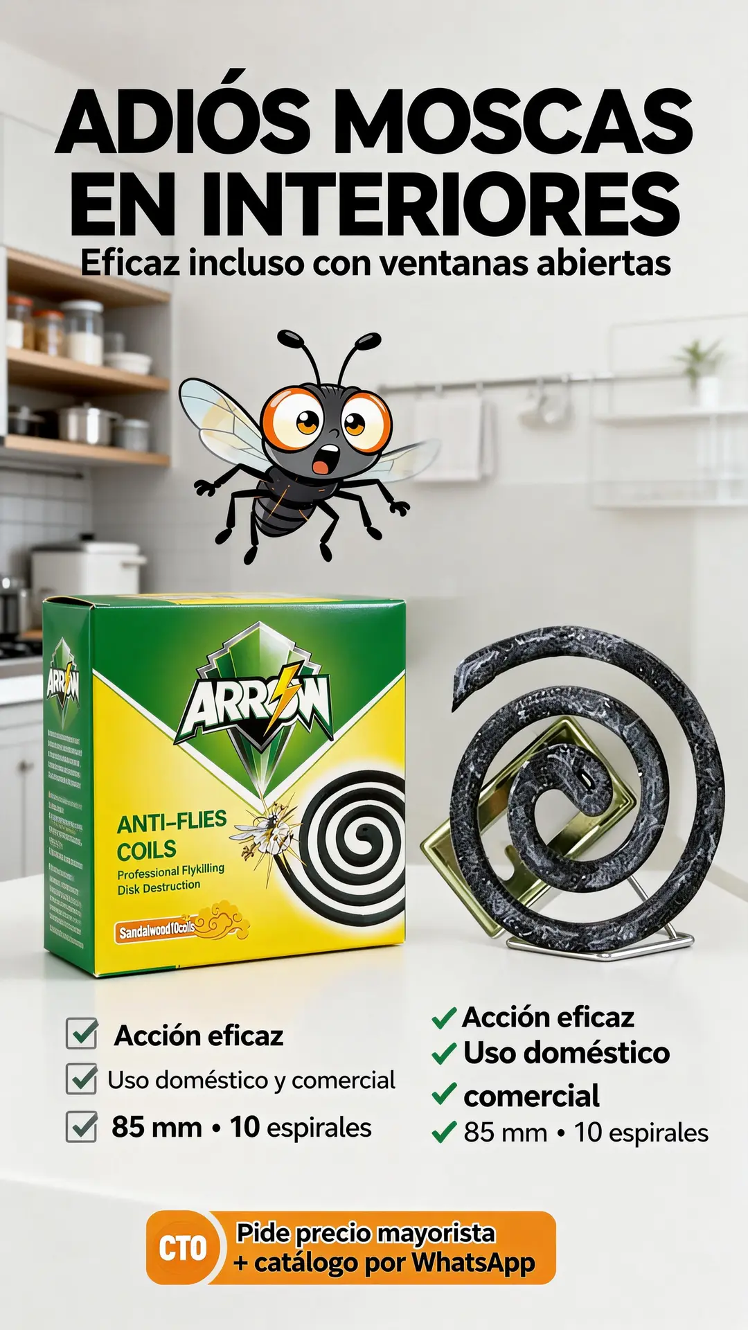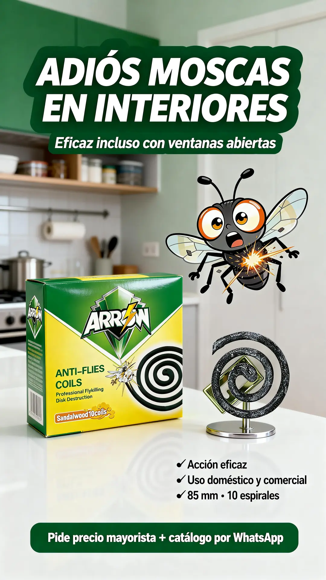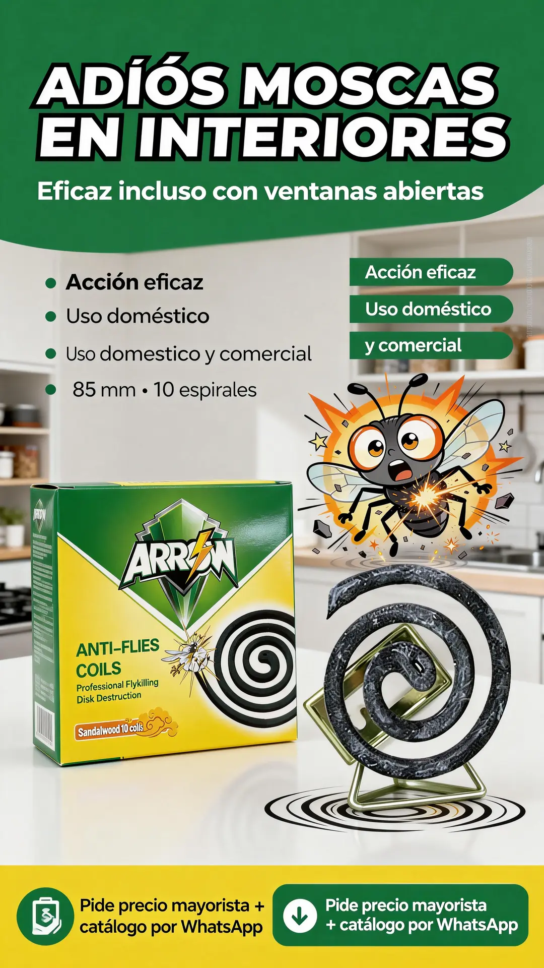 ¿Moscas en interiores? Prueba ARROW Anti-Moscas — acción rápida y humo ligero. Escríbenos para precio mayorista y catálogo.