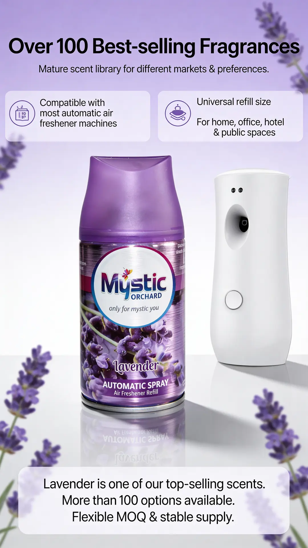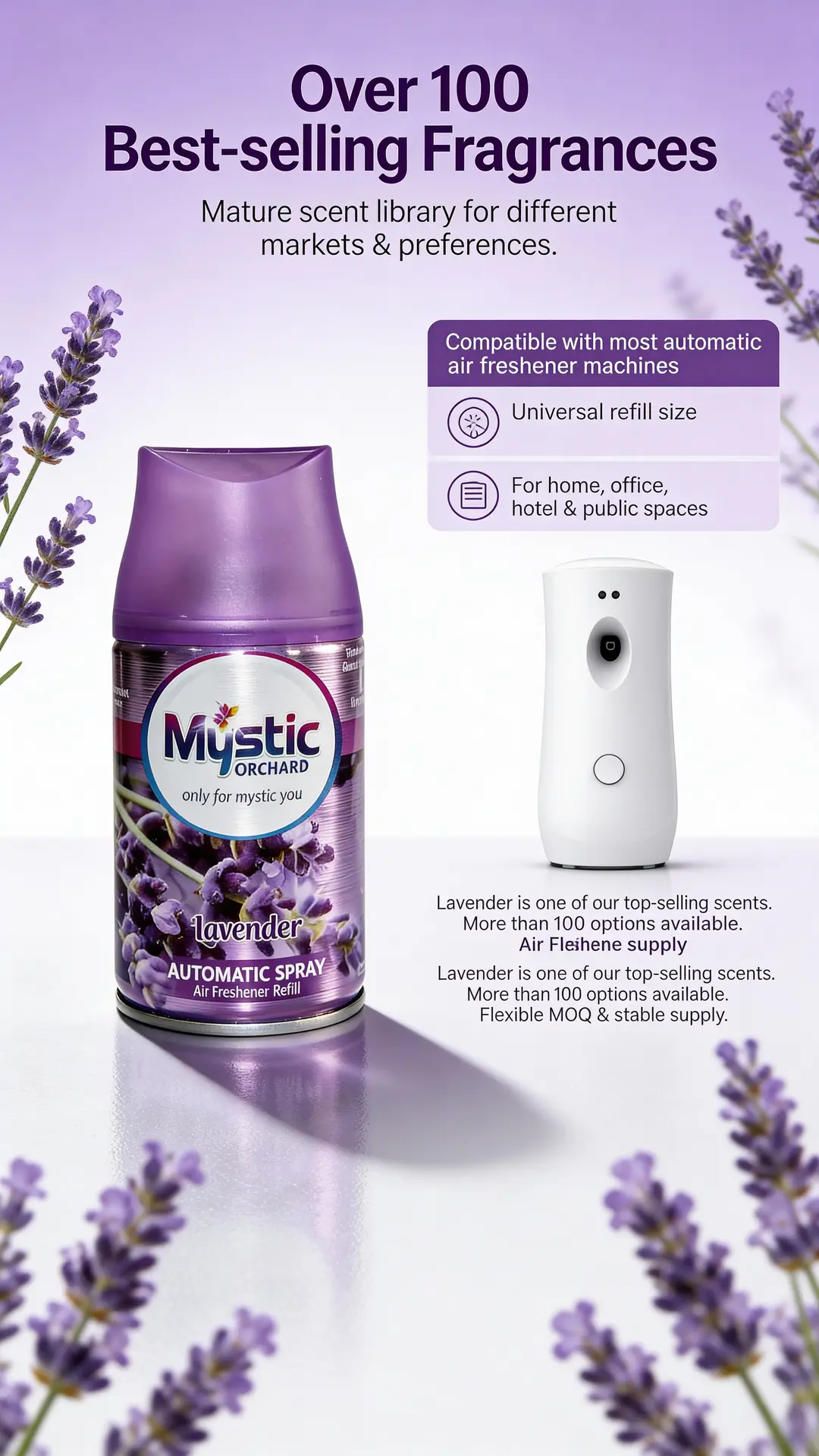 Designed for wide compatibility with mainstream automatic spray dispensers, this refill range offers 120+ market best-selling fragrances and stable factory supply for long-term distribution growth.